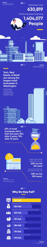 Across the US, most small businesses fail within the first two years. 20% of small businesses fail within the first year, 50% in five years, and 70% in ten years. In Washington State specifically, health care specific businesses have the strongest survival rate with 60% surviving past the first five years. Meanwhile, the industry in Washington with the lowest survival rate is construction with only 35% surviving by their fifth year.